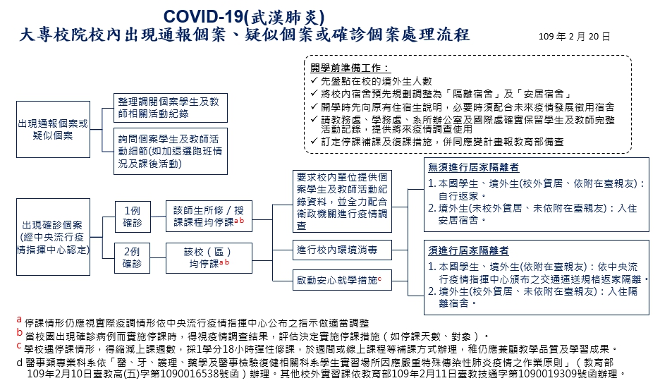 附件:校園因應『嚴重特殊傳染性肺炎』(武漢肺炎)疫情停課標準、大專校院校內出現通報個案、疑似個案或確診個案處理流程、區域中心學校諮詢窗口名單、大專校院嚴重特殊傳染性肺炎防治工作綱要、大專校院防範嚴重特殊傳染性肺炎之分區學校名單